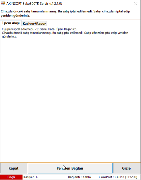 Beko 300Tr Yazarkasa Entegrasyonunda 'Cihazda Önceki Satış Tamamlanmamış' uyarısı çözümü.