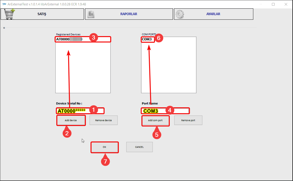 Kurulum işlemini yaptıktan sonra ilk olarak açılan ekran üzerine cihaz seri numarası ve bağlantı com port bilgilerini doldurmanız gerekmektedir.